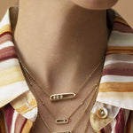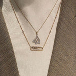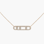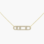 Our exquisite Melissa necklace in yellow gold, silver, or rose gold and diamonds features three moving diamonds with a brilliant cut. The filigree design with elegant pavé enhances the sparkle of the diamonds.